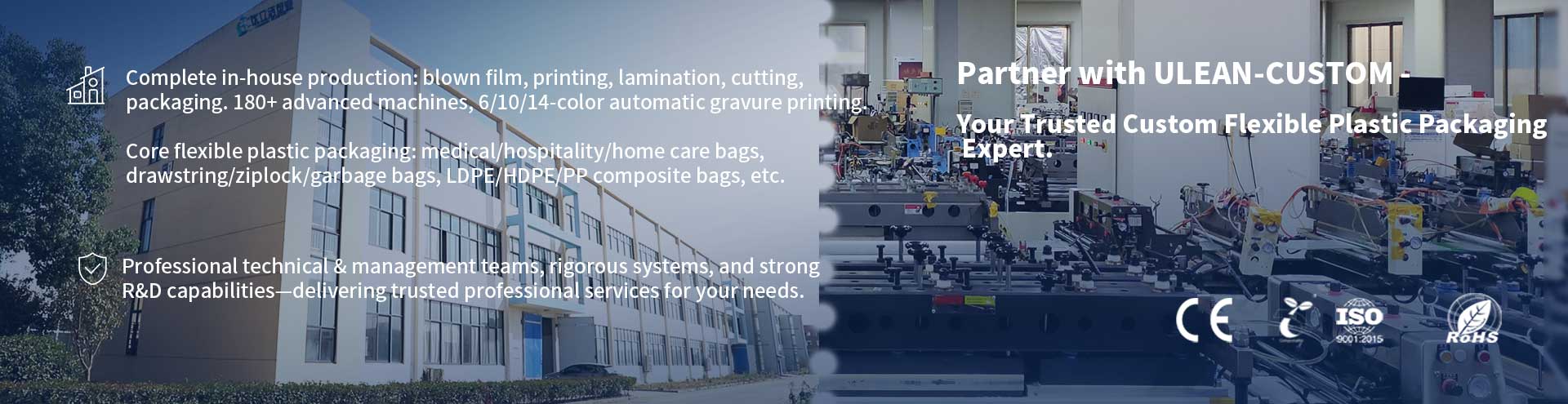 Компания ULEAN-CUSTOM, основанная в 2004 году, является надежным специалистом по пластиковой упаковке и расположена в городе Тунчэн, провинция Аньхой — «Центрально-китайской базе мягкой упаковки» — с удобным доступом к автомагистралям, железным дорогам, аэропортам и портам для осуществления глобальной логистики.
